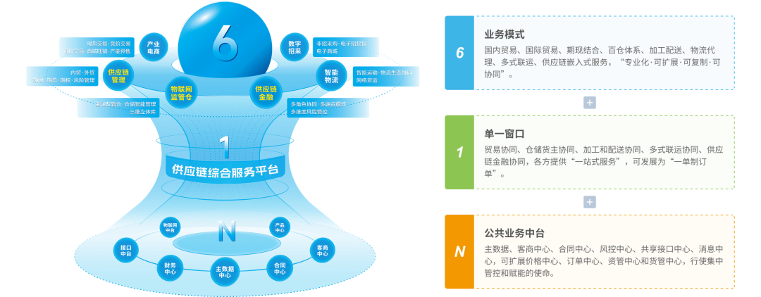 N 大管理维度:搭建合同中心、客商中心、订单中心、货管中心等N个管理中台,为 6 大核心业务平台提供底层技术支撑与能力输出,实现“业务标准化、数据一体化、风控智能化、运营协同化”。