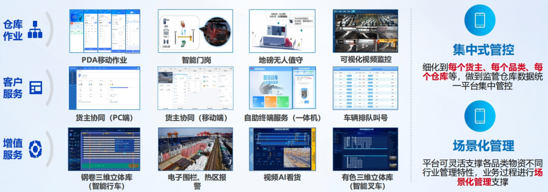 平台支持货主、物流公司、银行等多方协同,提供 PC 端、移动端、自助终端一体化服务,可针对钢卷、有色等大宗商品实现三维立体库管理、电子围栏、热区报警、视频 AI 看货等场景化管控,做到数据统一、监管透明、服务高效。